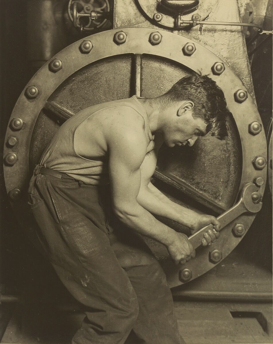 Focusing on each hinge and connection, the photo conveys the photographer's thrill in front of huge machines, but the main idea is that these huge machines can only work thanks to the hard image work of American workers. This is a symbiosis between man and machine, and a wrench is a channel between metal and flesh. In this carefully constructed snapshot, Hein turns a worker into a symbol of industrial America.