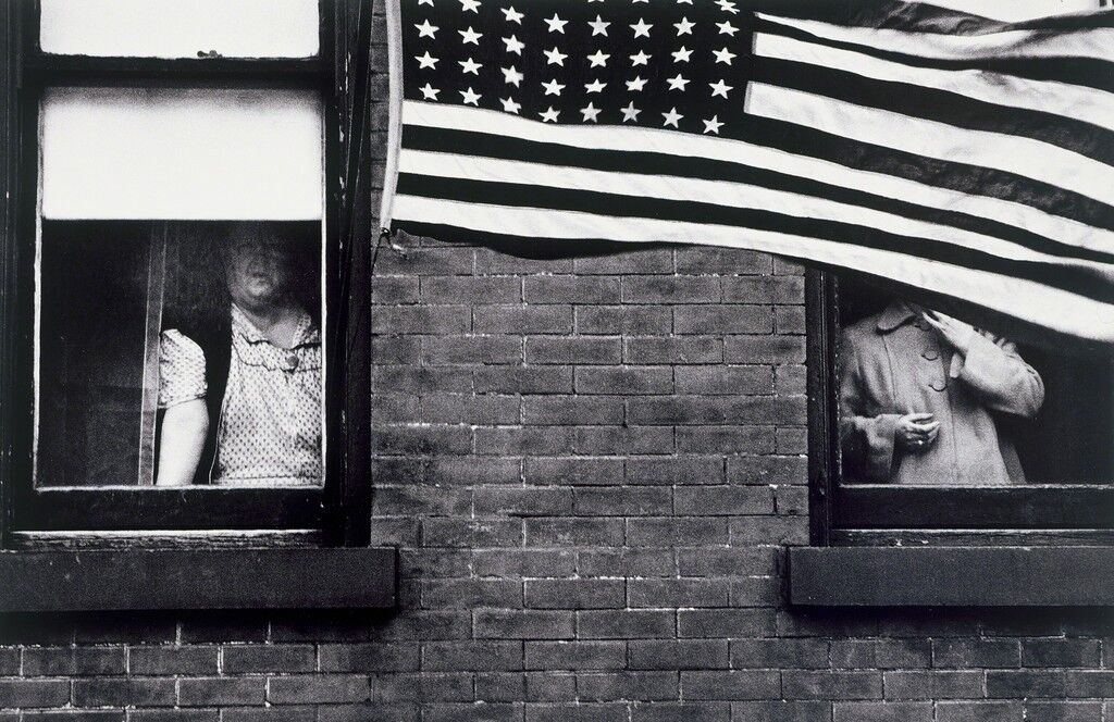 In the photo - two women who look at the parade from the windows of a residential building. The first woman, an elderly and full, face is hidden by the shadow of half-let curtains, she is dressed in a dress that was clearly not fashionable even at that time. Another woman's face is completely hidden by the American flag, she is wearing a warm coat.